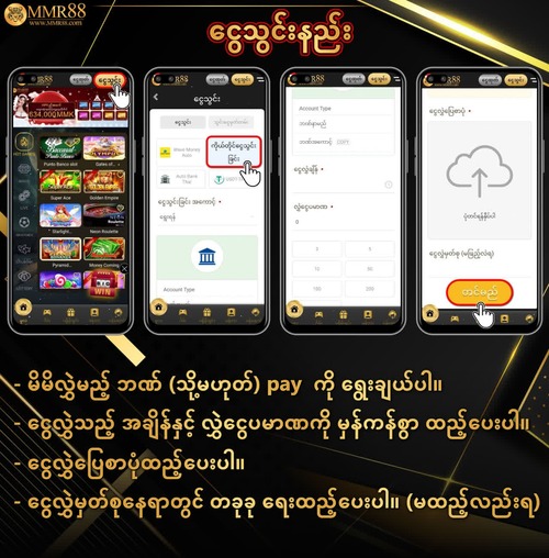 MMR88သည် ၎င်း၏အသုံးပြုသူများ အဆင်ပြေစေရန်အတွက် ငွေသွင်းခြင်းနှင့် ထုတ်ယူခြင်းအတွက် နည်းလမ်းအမျိုးမျိုးကို ပေးဆောင်သည်-
